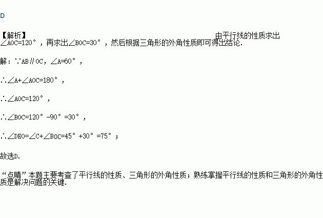如图,将一副三角板叠放在一起,使直角的顶点重合于点O, AB∥OC,CD与OA交于点E,已知∠A=30°,则∠DEO的度数为( )