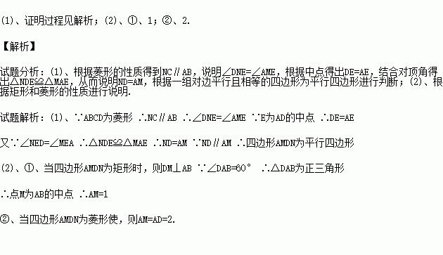 如图,在菱形ABCD中,AB=2,∠DAB=60°,点E是AD边的中点,点M是AB边上一动点(不与点A重合),延长ME交射线CD于点N,连接MD,AN.