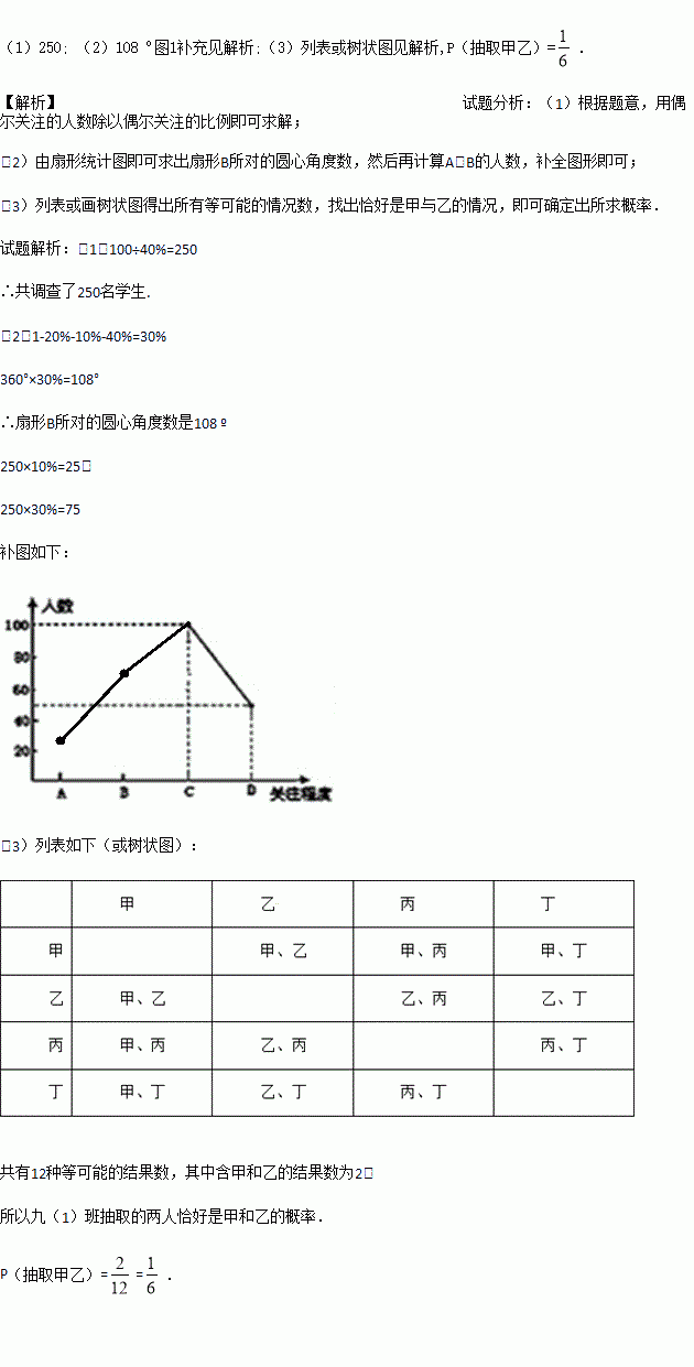 (3)在这次调查中,九(1)班共有甲、乙、丙、丁四人“特别关注”本届互联网大会,现准备从四人中随机抽取两人进行交流,请用列表法或画树状图的方法求出抽取的两人恰好是甲和乙的概率.
