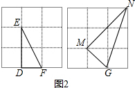 解答 解:(1)AB=$\sqrt{{4}^{2}+{2}^{2}}$=2$\sqrt{5}$,∵AB2+AC2=20+5=25,BC2=25,∴AB2+AC2=BC2,∴∠BAC=90°,故答案为:2$\sqrt{5}$,90;(2)如图所示:△DEF和△MNG都是符合题意的图形.