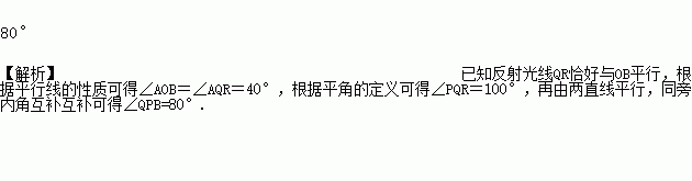 如图,∠AOB的两边OA、OB均为平面反光镜,∠AOB=40°,在射线OB上有一点P,从点P点射出的一束光线经OA上的Q点反射后,反射光线QR恰好与OB平行,则∠QPB的度数是___________