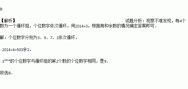 观察下列算式:31=3,32=9,33=27,34=81,35=243,36=729,…,通过观察,用你所发现的规律确定32014的个位数字是( )