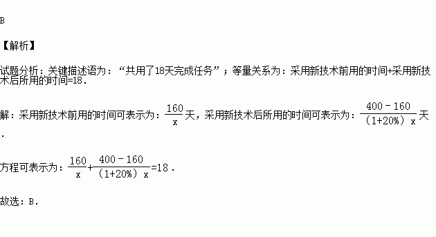 (2013•本溪)某服装加工厂计划加工400套运动服,在加工完160套后,采用了新技术,工作效率比原计划提高了20%,结果共用了18天完成全部任务.设原计划每天加工x套运动服,根据题意可列方程为( )