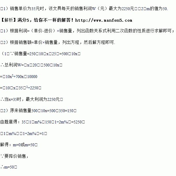 (2)经过试营销后,商场就按(1)中单价销售.为了回馈广大顾客,同时提高该文具知名度,商场营销部决定在11月11日(双十一)当天开展降价促销活动,若每件文具降价m%,则可多售出2m%件文具,结果当天销售额为5250元,求m的值.