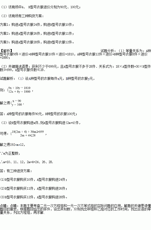 万美服装城准备进一批两种不同型号的衣服,已知购进A种型号衣服9件,B种型号衣服10件,则共需1810元;若购进A种型号衣服12件,B种型号衣服8件,共需1880元;已知销售一件A型号衣服可获利18元,销售一件B型号衣服可获利30元,要使在这次销售中获利不少于699元,且A型号衣服不多于28件.
