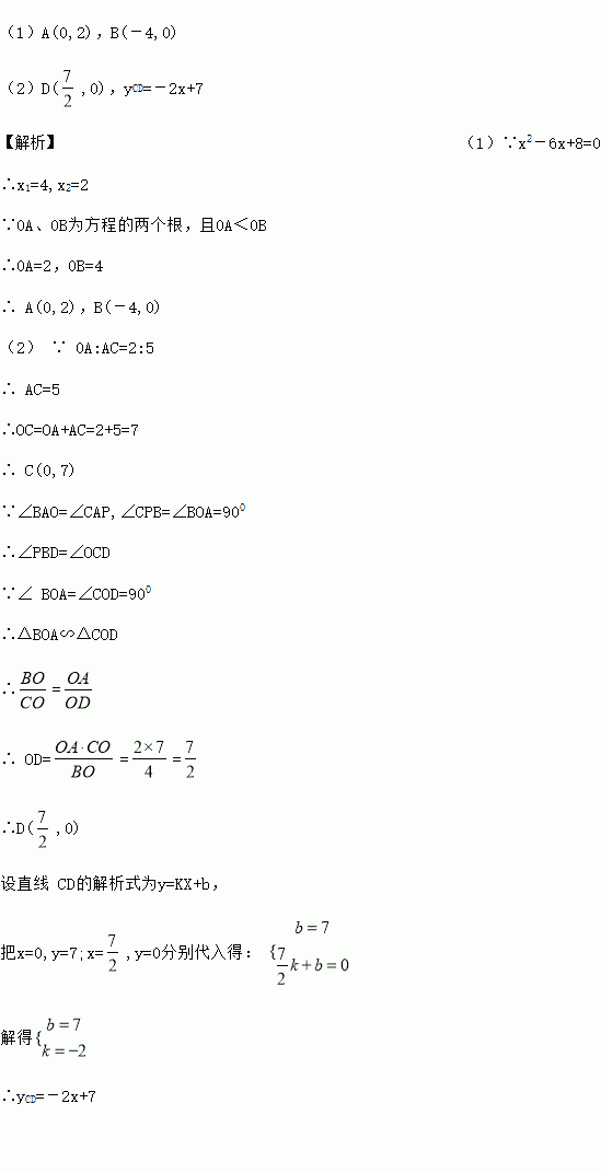 如图,直线AB与坐标轴分别交于点A、点B,且OA、OB的长分别为方程x2-6x+8=0的两个根(OA<OB),点C在y轴上,且OA︰AC=2︰5,直线CD垂直于直线AB于点P,交x轴于点D。