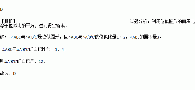 △ABC与△A′B′C′是位似图形,且△ABC与△A′B′C′的位似比是1:2,已知△ABC的面积是3,则△A′B′C′的面积是
