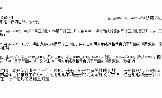 C. 如果AD=BC,AC⊥BD,那么四边形ABCD是菱形