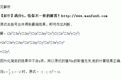 有这样一道题:“计算(2x3-3x2y-2xy2)-(x3-2xy2+y3)+(-x3+3x2y-y3)的值,其中x=