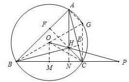 解答 解:(1)如图:连接BO并延长交⊙O于点G,连接AG、CG、CO,延长CH交AB于F,延长BH交AC于E,延长AH交BC于N,作OM⊥BC于M.![]()