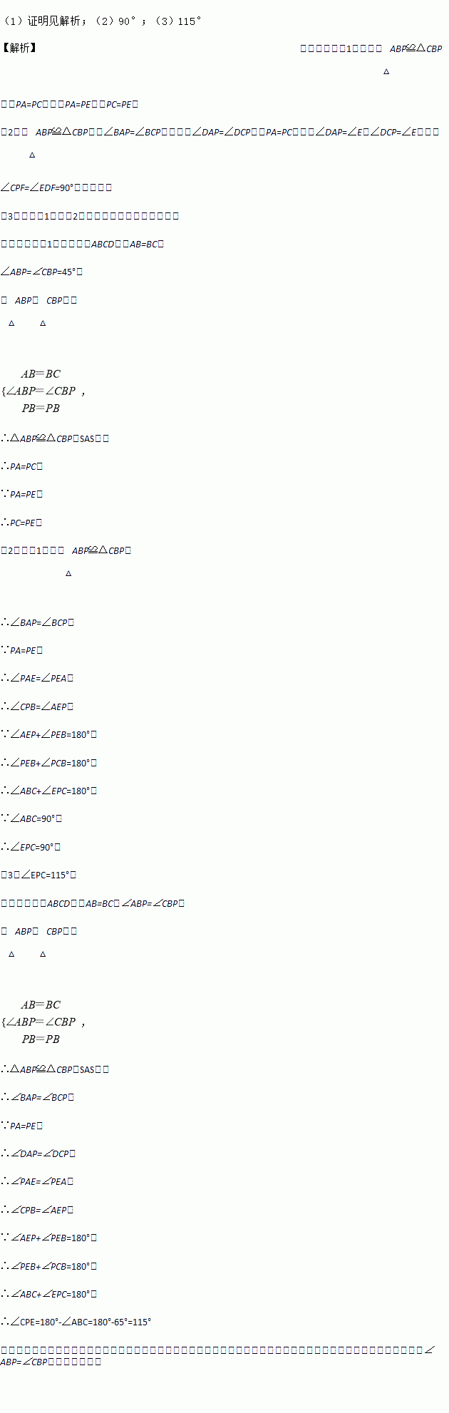 (3)如图②,把正方形ABCD改为菱形ABCD,其它条件不变,若∠ABC=65°,则∠CPE=________度.