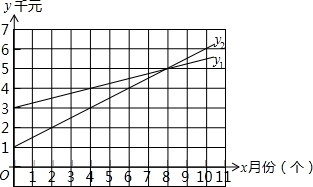 (3)由图象可知:①当使用时间为9个月时,直线y1落在直线y2的下方,y1<y2,即方案1省钱;