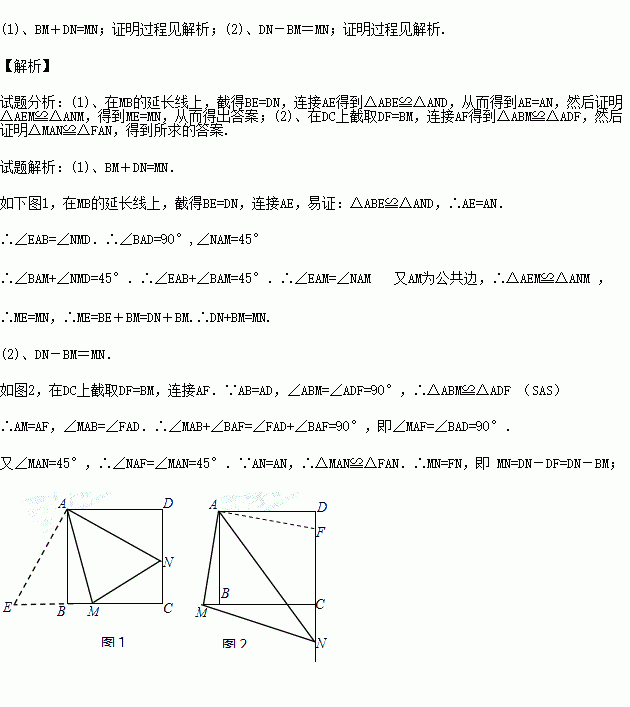 已知正方形ABCD中,∠MAN=45°,∠MAN绕点A顺时针旋转,它的两边分别交CB、DC(或它们的延长线)于点M、N.当∠MAN绕点A旋转到BM=DN时(如图12),易证BM+DN=MN.