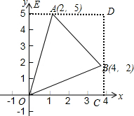 解答 解:如图,∵A(2,5),B(4,2),∴OC=4,OE=5,AE=2,AD=2,BD=2,BC=2,∴∴S△OAB=4×5-$\frac{1}{2}$×4×2-$\frac{1}{2}$×5×2-$\frac{1}{2}$×2×3=8.