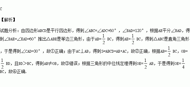 BC ,连接OE .下列 结论:①∠CAD=300 ② S□ABCD=AB•AC ③ OB=AB ④ OE=