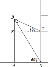 数学活动课上老师让学生以小组为单位测量学校旗杆AB的高度,如图所示,“希望小组”在教学楼一楼地面D处测得旗杆顶部仰角为60°,在教学楼三楼地面C处测得旗杆顶部仰角为30°,已知旗杆底部于教学楼一楼地面在同一水平线上,每层楼高为3米,求旗杆AB高度.