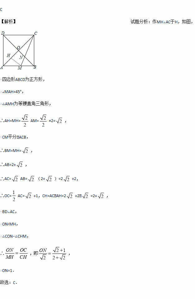 如图,正方形ABCD的对角线AC与BD相交于点O,∠ACB的角平分线分别交AB,BD于M,N两点.若AM=2,则线段ON的长为( )