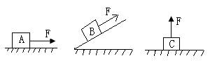 如图所示,mA>mB>mC,三个物体在同样大小的力F的作用下,都沿着力F的方向移动距离s,比较F对三个物体所做的功,结论是: