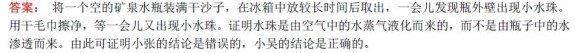 小张将一瓶矿泉水在冰箱中放较长时间后取出,一会儿发现瓶外壁出现小水珠。用干毛巾擦净,等一会儿又出现小水珠。于是他与小吴一起对此现象进行研究,但观点不一致。小张认为这是矿泉水瓶内的水往外渗透后,附着在矿泉水瓶外壁上;而小吴则认为是空气中的水蒸气液化成小水珠附着在矿泉水瓶外壁上。请你设计一个实验证明他俩的结论是否正确。