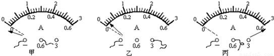 甲、乙、丙三位同学在做“用电流表测电流”的分组实验中,闭合开关前,他们的电流表指针均指在零刻度处.当闭合开关试触时,发现电流表指针摆动分别出现了如图甲、乙、丙所示的三种情况.请分析他们在电流表的使用上分别存在什么问题,并写在下面的横线上.