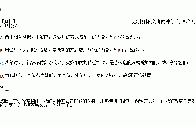 C. 炒菜时,用锅铲不停翻炒蔬菜 D. 气体膨胀,气体温度降低