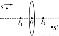 由(1)(2)得,点光源S沿平行主轴的方向向透镜移动时,像点沿F2与S’连线方向远离凸透镜.