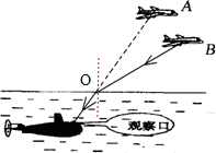 如图所示,图中有两架飞机,其中一架是实际飞机所在位置,另一架是从潜水艇上观察到该飞机的像,请用作图法指出A、B 两架飞机中,哪架飞机是实际飞机,哪一架是它的像。