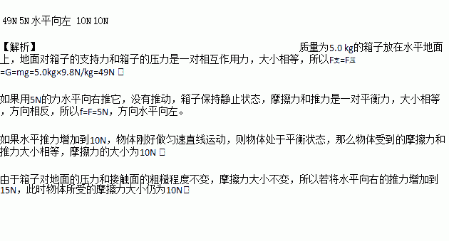 质量为5.0kg的箱子放在水平地面上,地面对箱子的支持力大小为________N静止在粗糙的水平地面上,如果用5N的力水平向右推它,没有推动,则物体所受的摩擦力大小为_______N,方向________;如果水平推力增加到10N,物体刚好做匀速直线运动,那么物体的受摩擦力的大小为_________N;若将水平向右的推力增加到15N,此时物体所受的摩擦力大小为________N。