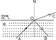 (2)过入射点O做法线ON,从而确定了入射光线位于法线的左侧,并确定了入射角的大小.然后利用光的反射规律做出对应的反射光线OB.光从水中斜射入空气,所以折射角大于入射角,由此可以做出对应的折射光线OC.如下图所示:![]()