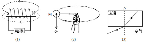 (3)过入射点作法线,根据折射定律的内容,光从玻璃中斜射入空气时,折射光线和入射光线分居法线两侧,折射角大于入射角,在空气中法线的另一侧作出折射光线,如图所示:![]()