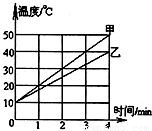 我们可以用相同的酒精灯加热时间4min,甲和乙吸收的热量就是相同的,甲的温度变化值为50℃-10℃=40℃,乙的温度变化值为40℃-10℃=30℃,