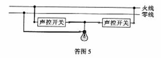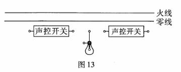 (5)声控开关在接收到一定响度的声音时会自动闭合一段时间。某地下通道两端的人口处各装有一个声控开关来控制同一盏螺纹灯泡,为确保行人不管从哪端进人,灯泡都能接通电源发光。请按题意将图13的电路连接完整。