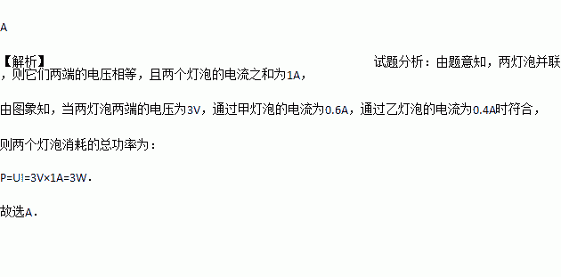 分别标有“6V 6W”和“6V 3W”的甲、乙两只灯泡,经实验测得其I-U特性曲线如图所示。现将甲、乙两灯并联在电路中,当两只灯泡的总电流为1A时,两只灯泡消耗的总功率是( )