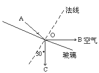 如图所示,有一条光线从空气斜射到玻璃,入射角是60°,入射光线、反射光线、折射光线在图中用带箭头的线表示,O是入射点,已知OB、OC是垂直的,AO、OC间夹角是150°,请在图中画出法线和空气、玻璃的分界面,标出折射角的大小。