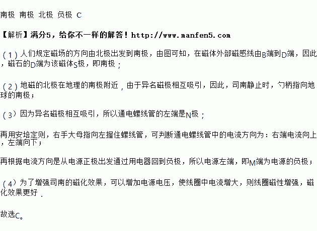 (3)将该司南悬挂在电磁铁正上方,闭合开关S,司南静止时的指向如图丁所示,则电磁铁左端是_____ (选填“北极”或“南极”)极,则电源M端是________ (选填“正极”或“负极”).