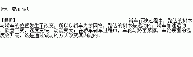 在轿车行驶过程中,以轿车为参照物,路边的树木是_____的;轿车在加速过程中,其动能_____(选填“增加”、“不变”或“减小”);在轿车刹车过程中,车轮表面的温度会升高,这是通过_____的方式改变其内能。