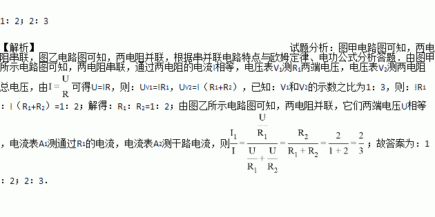 如图甲所示电路中,电压表V1和V2的示数之比为1:3,则定值电阻R1:R2= ;若将电阻R1、R2改接为如图乙所示的电路,则电流表A1、A2的示数之比为 .
