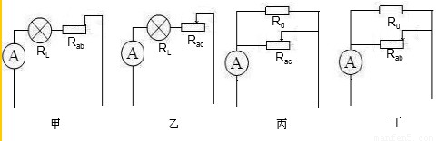 丁图:当开关S1、S2都闭合时,R与滑动变阻器并联,要使总功率最小,电源电压一定,电路总电流最小,总电阻最大,滑动变阻器电阻最大,电路总电阻最大,所以,R与Rab并联,