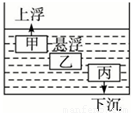 如图所示,体积相同的甲、乙、丙三个物体浸没在水中.甲上浮、乙悬浮、丙下沉,在甲露出水面之前,关于它们所受浮力的说法正确的是( )