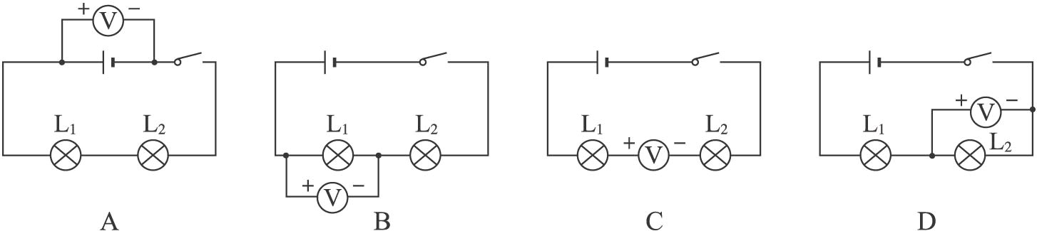 如图所示的电路中,符合电压表测灯L2两端电压的图是: