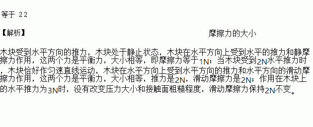一木块静止在水平地面上,若用1N的水平推力推木块没有推动,此时木块受到的摩擦力________1N(选填“大于”、“等于”、“小于”),若用2N的水平推力刚好能推动木块匀速前进,此时木块受到的摩擦力为_______N,若用3N的水平推力推动木块前进时,木块受到的摩擦力为_______N。
