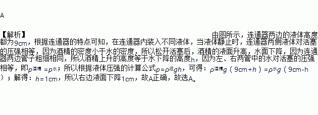 ÈçͼÊÇÁ½±ß¹Ü×Ó´ÖϸÏàͬ¡¢×ã¹»¸ßµÄÁ¬Í¨Æ÷£¬Æäˮƽϸ¹Ü×ã¹»³¤£¬ÖмäÓÐÒ»¸ö¿ÉÎÞĦ²ÁÒÆ¶¯µÄ»îÈû£®¸Õ¿ªÊ¼»îÈû¹Ì¶¨²»¶¯£¬Á½¹ÜÒºÃæÏàÆ½£¬×ó¹ÜÒºÌåÊǾƾ«£¨¦Ñ¾Æ¾«=0.8xl03 kg/m3£©£¬ÓÒ¹ÜÒºÌåÊÇË®£¨¦ÑË®=1.0xl03 kg/m3£©£®ÏÖËÉ¿ª»îÈû£¬ÖØÐÂÎȶ¨ºó£¨¡¡¡¡£©
