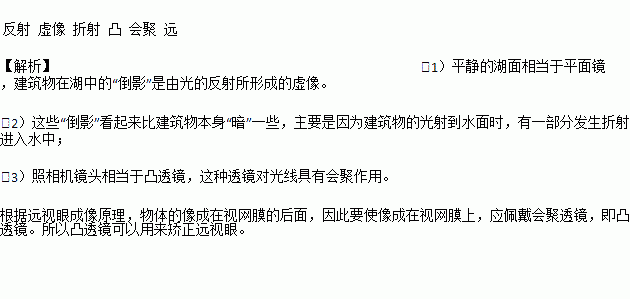 风景旖旎的镜湖,各式现代建筑环湖矗立,充满时代气息。如图所示,建筑物在湖中的“倒影”是由光的________所形成的________(填“实像”或“虚像”)。这些“倒影”看起来比建筑物本身“暗”一些,主要是因为建筑物的光射到水面时,有一部分发生________进入了水中;拍摄该照片的照相机镜头相当于________透镜,这种透镜对光线具有________作用,可用来矫正________(填“近”或“远”)视眼。