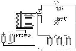 (3)某同学利用PTC电阻设计了一个“过热自动报警电路”:将PTC电阻安装在需要探测温度的地方,当环境温度正常时,指示灯亮;当环境温度超过PTC电阻的居里点温度时,由于电阻变化,导致电磁铁磁性减弱,使警铃响.请帮他将如图(2)所示的电路连接完整.