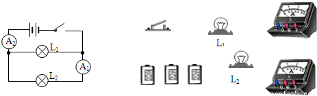 如图所示,电流表A1示数为0.4A,电流表A2的示数为1.5A,根据电路图,用笔画线作导线把右边的实物连接起来.(导线不要交叉)