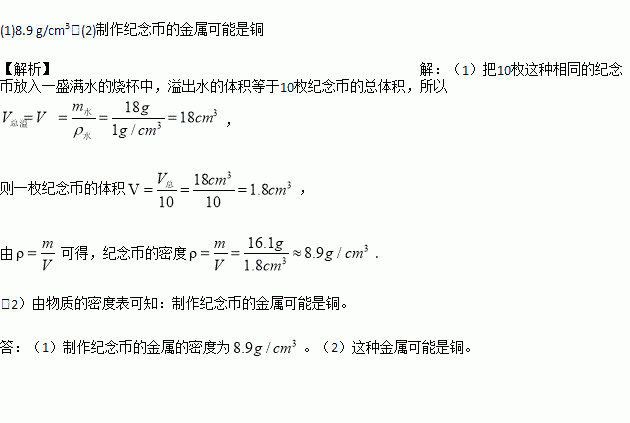 有一种纪念币,它的质量是16.1g。为了测量它的体积,把10枚这种相同的纪念币放入一盛满水的烧杯中,测得溢出的水的质量是18g。如图所示是一些物质的密度。