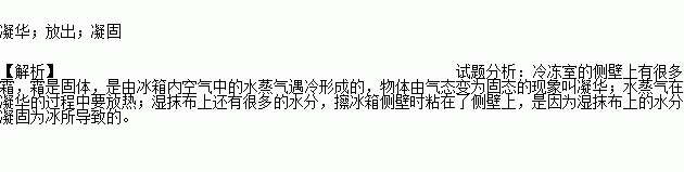 小欣打开冰箱门,发现冷冻室的侧壁上有很多霜,这是水蒸气_______(填物态变化的名称)形成的,这个过程中水蒸气______(填“吸收”或“放出”)热量。当他拿起湿抹布去擦时,抹布却粘在了侧壁上,这是因为发生了_______(填物态变化的名称)现象。