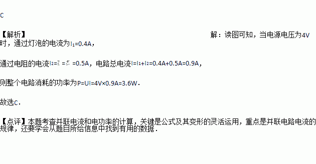 标有“6V 3W”的小灯泡,通过它的电流与电压的关系如图所示.若把它与一只阻值为8Ω的电阻并联接在电压为4V的电路中,则整个电路消耗的功率为