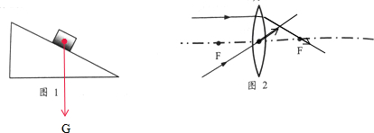 (2)图示的折射光线平行于主光轴,则入射光线过焦点.过光心的光线经凸透镜折射后传播方向不改变.由此可以画出折射光线和入射光线,如下图所示:![]()