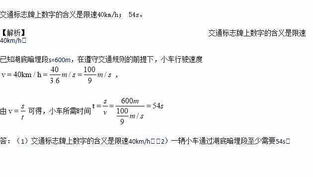 江西首条湖底隧道开通。这条隧道西起阳明东路京九线隧道,东至国威路和上海北路交叉口,全长1965m,双向6车道,其中湖底暗埋段600m。在湖底隧道口有一交通标志牌如图所示,交通标志牌上数字的含义是什么?在遵守交通规则的前提下,一辆小车通过湖底暗埋段至少需要多长时间?